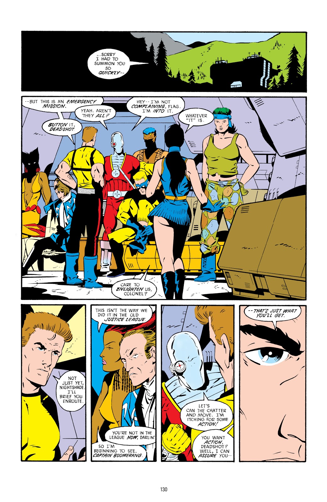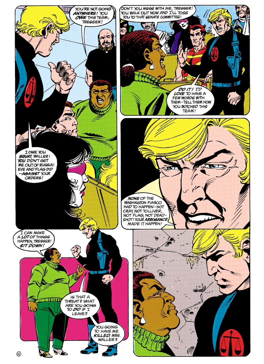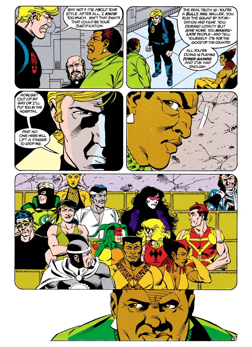 Primeira aparição nos quadrinhos (literalmente) de Amanda Waller. Criada por John Ostrander, na arte de John Byrne. O diálogo é uma resposta dela para uma citação racista com referência à plantações americanas de algodão
