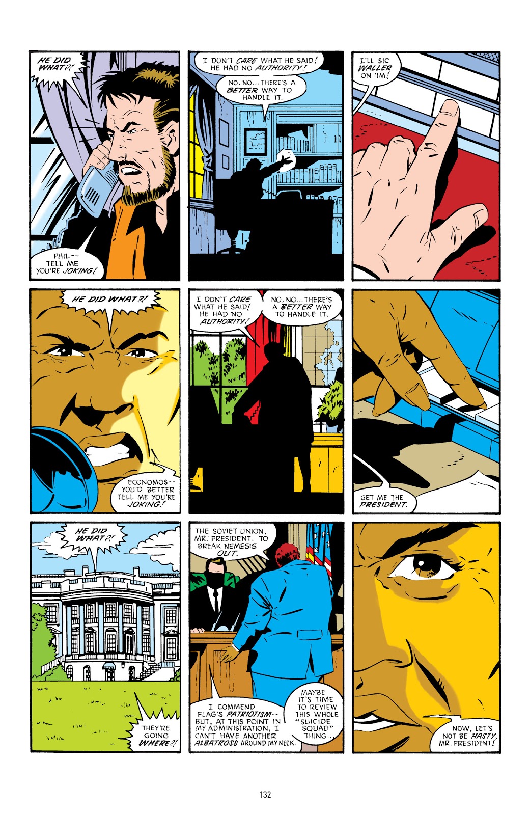Amanda Waller se reúne com o Presidente Ronald Reagan para criar o Esquadrão Suicida. Junto está um dos conselheiros do presidente, Sargento Steel