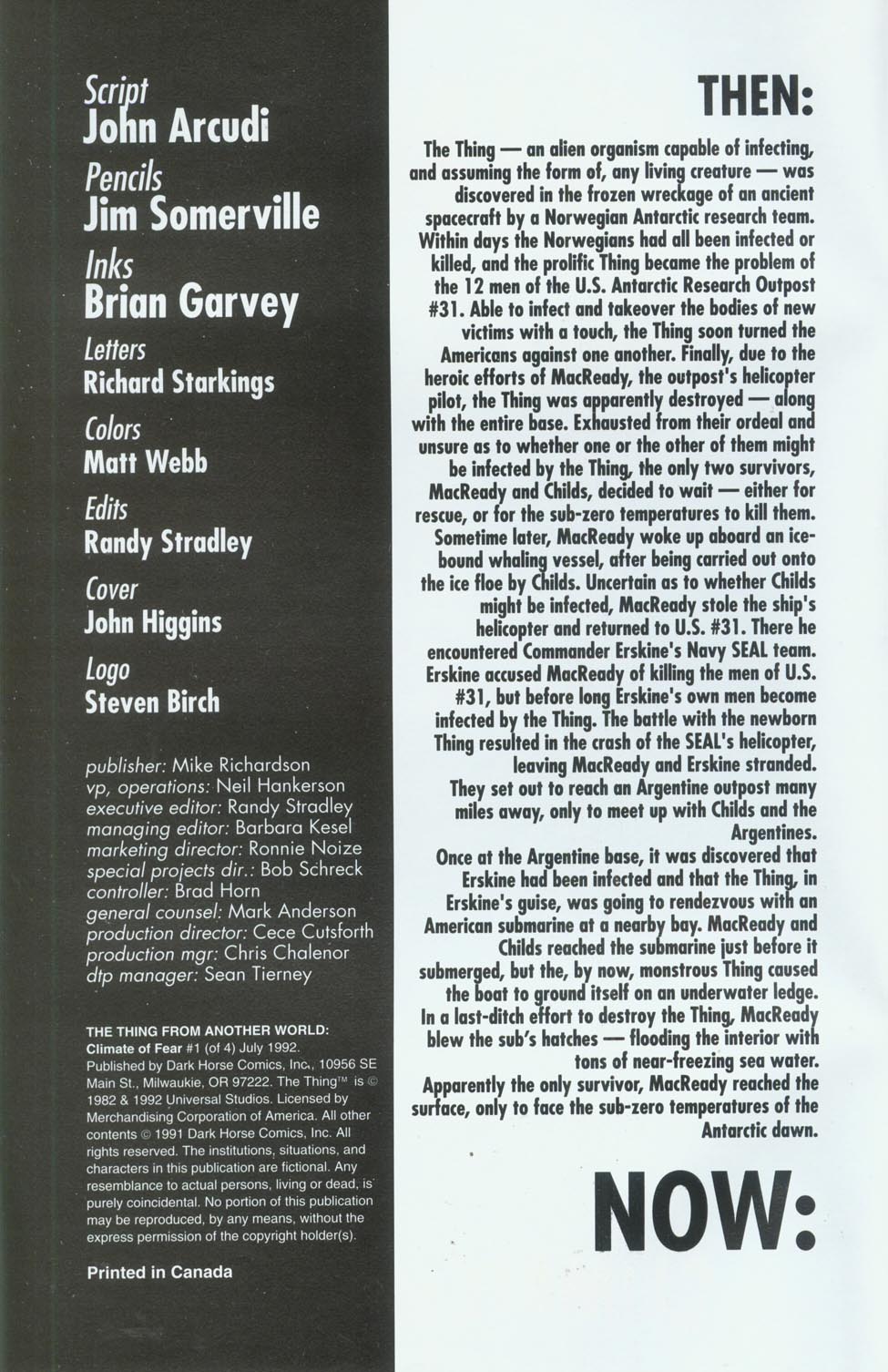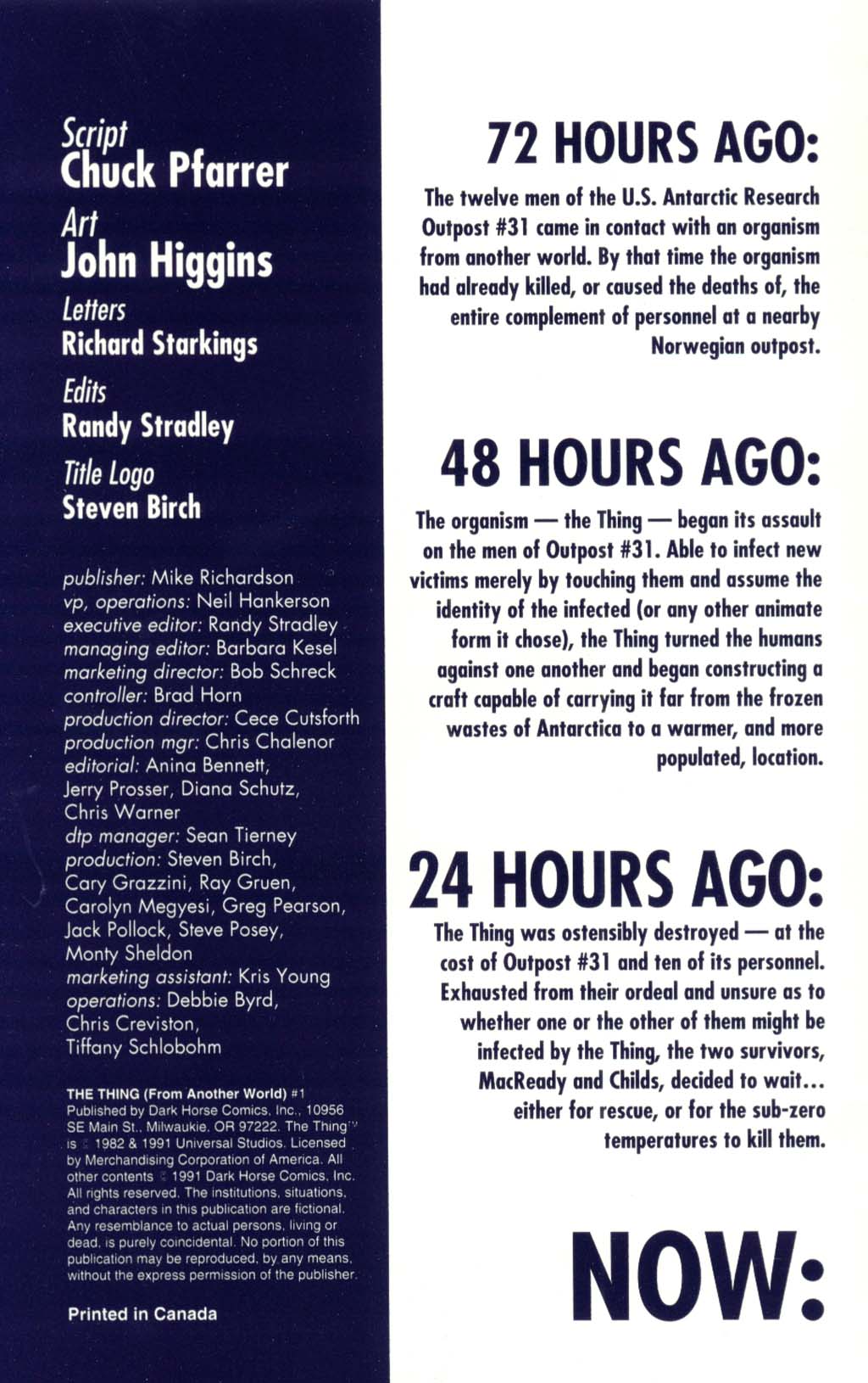 Quando a nave some, o letreiro do título do filme entra The Thing, com a mesma fonte usada em O Monstro do Ártico. Carpenter então faz um corte gigantesco de tempo, nos situando no inverno de 1982. Estamos na Antártida, e vemos um helicóptero com dois tripulantes — um deles armado — que tentam matar um cachorro em perseguição pela neve.