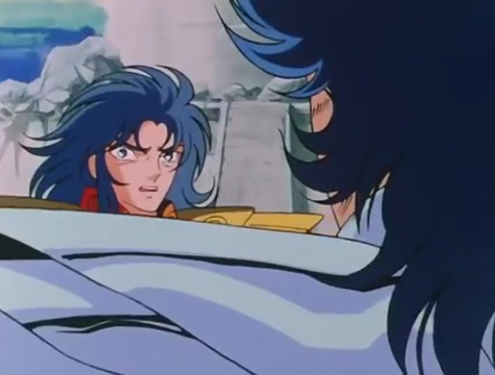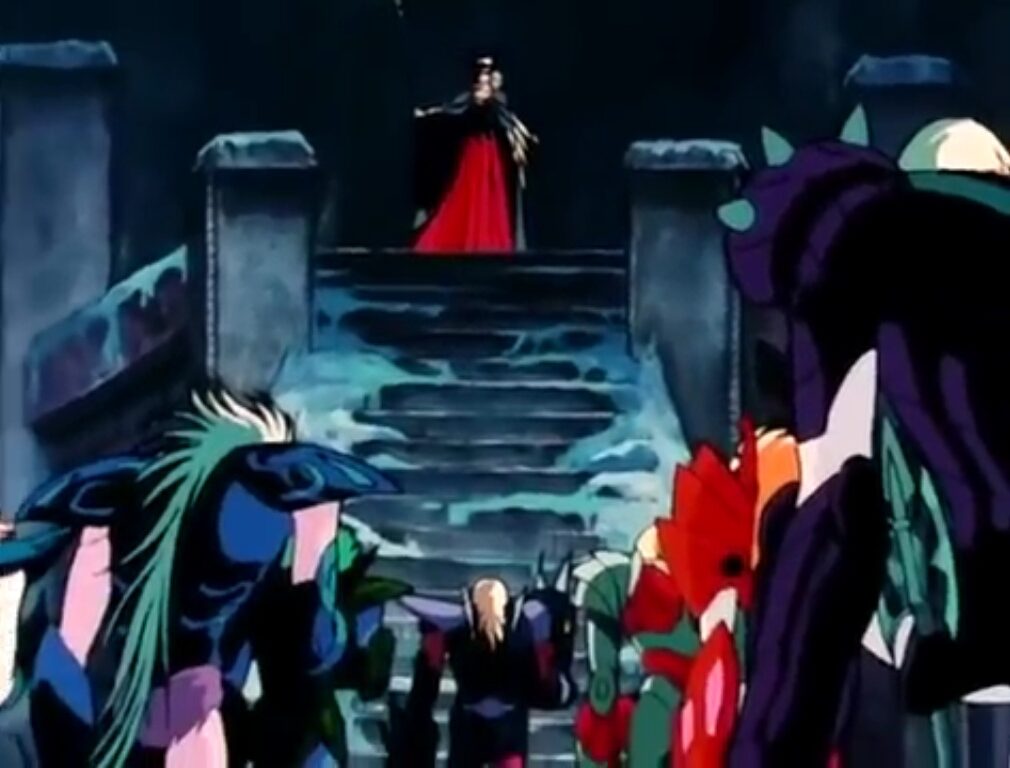 A primeira menção de Hades foi essa feita acima, por Saga, mas a “primeira aparição” foi ainda na série clássica, no episódio Um Bruxo do Mar! A Canção da Morte (01×97), na Saga de Asgard, quando o General Marina Sorento de Sirene explica sobre os deuses — mais precisamente, sobre Atena, Zeus, Poseidon e Hades — para os cavaleiros.