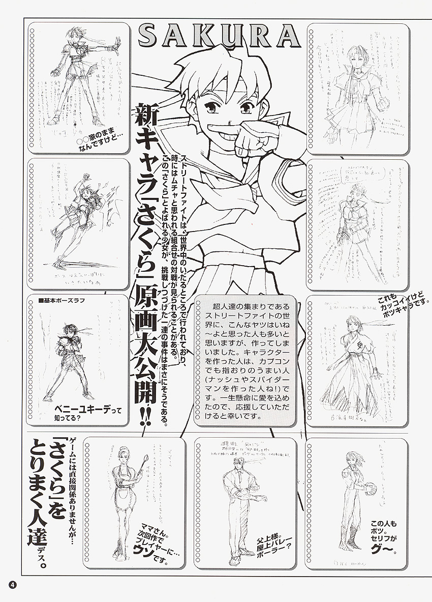 Outro character design de SFZ foi Bengus (nome desconhecido, também se apresenta como Mido Shiito, CRMK, Holy Homerun). Quando ajudou a criar Street Fighter Zero 2, a Sakura se tornou sua personagem preferida.
