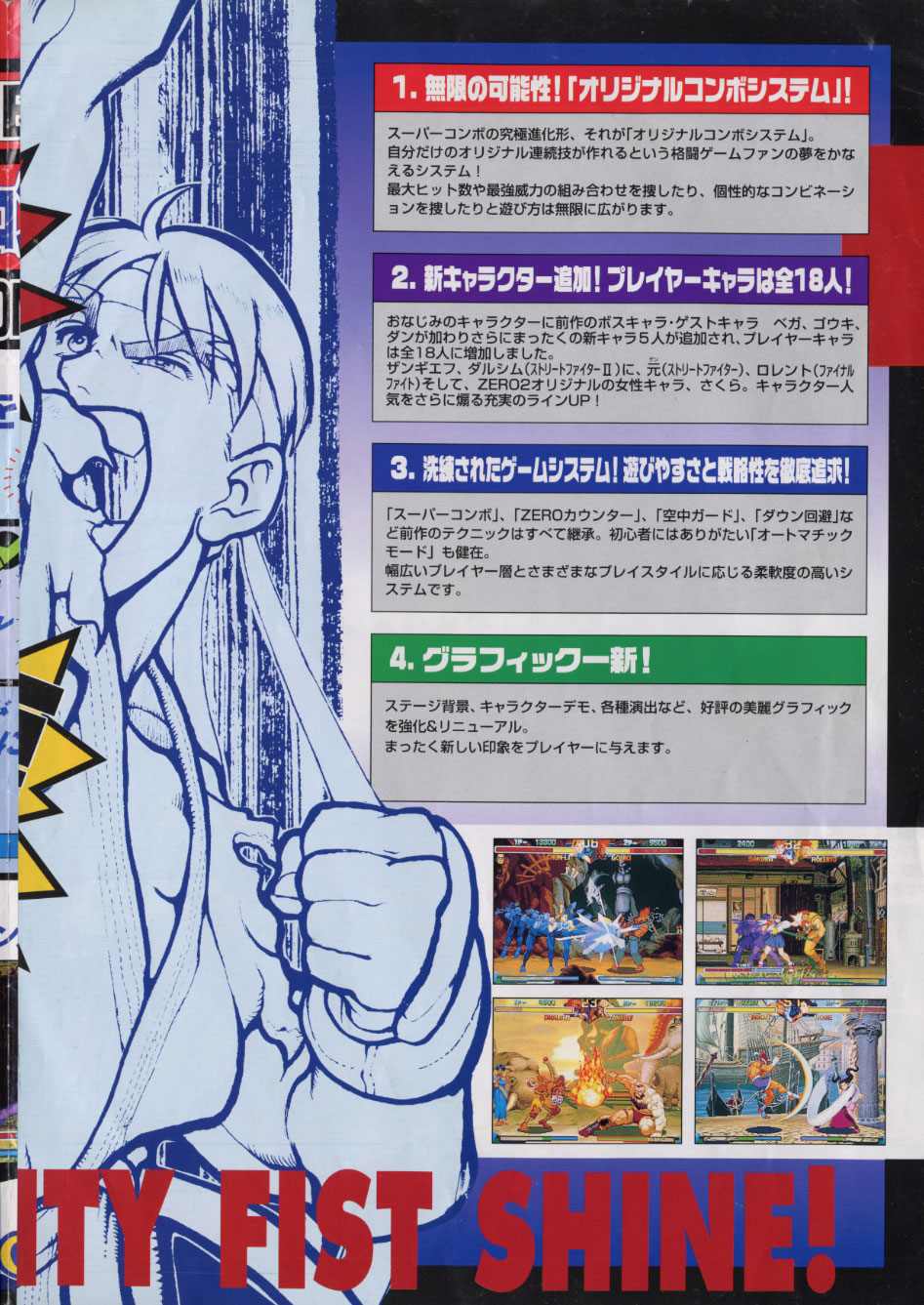Agora havia combos para ligar pancadas e contadores nos informavam quantas vezes seguidas o oponente era atingido. Tudo que havia apenas sido rascunhado no game Super Street Fighter II Turbo (1994), foi aprimorado na nova marca Street Fighter Zero.